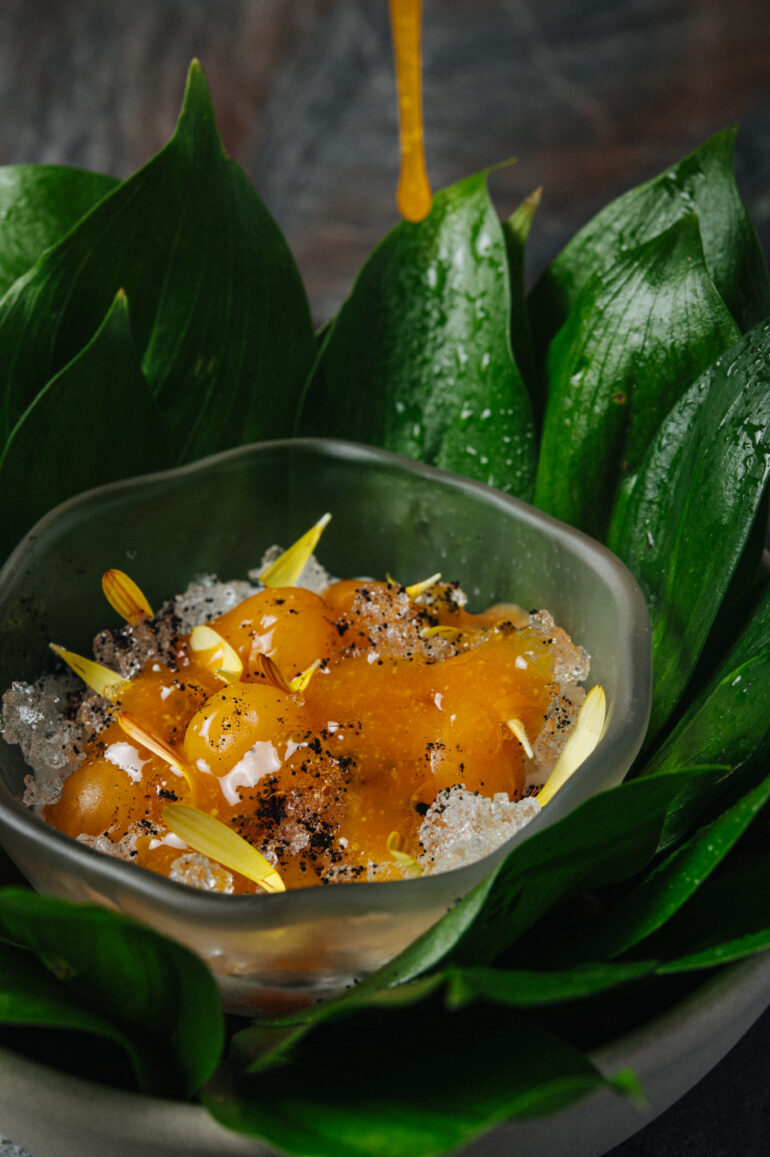 Venturing into the transitional zone between cloud forest and mountainous jungle, this refreshing interlude highlights the region’s signature produce. Tangy citrus fruits mingle with sweet-tart physalis (also known as goldenberry). A drizzle or infusion of caña mater—a mysterious local cane or herbal infusion—brings gentle warmth and a faintly floral undertone. The result is an invigorating palate cleanser that’s both exotic and familiar, capturing the essence of the high jungle’s hidden groves.