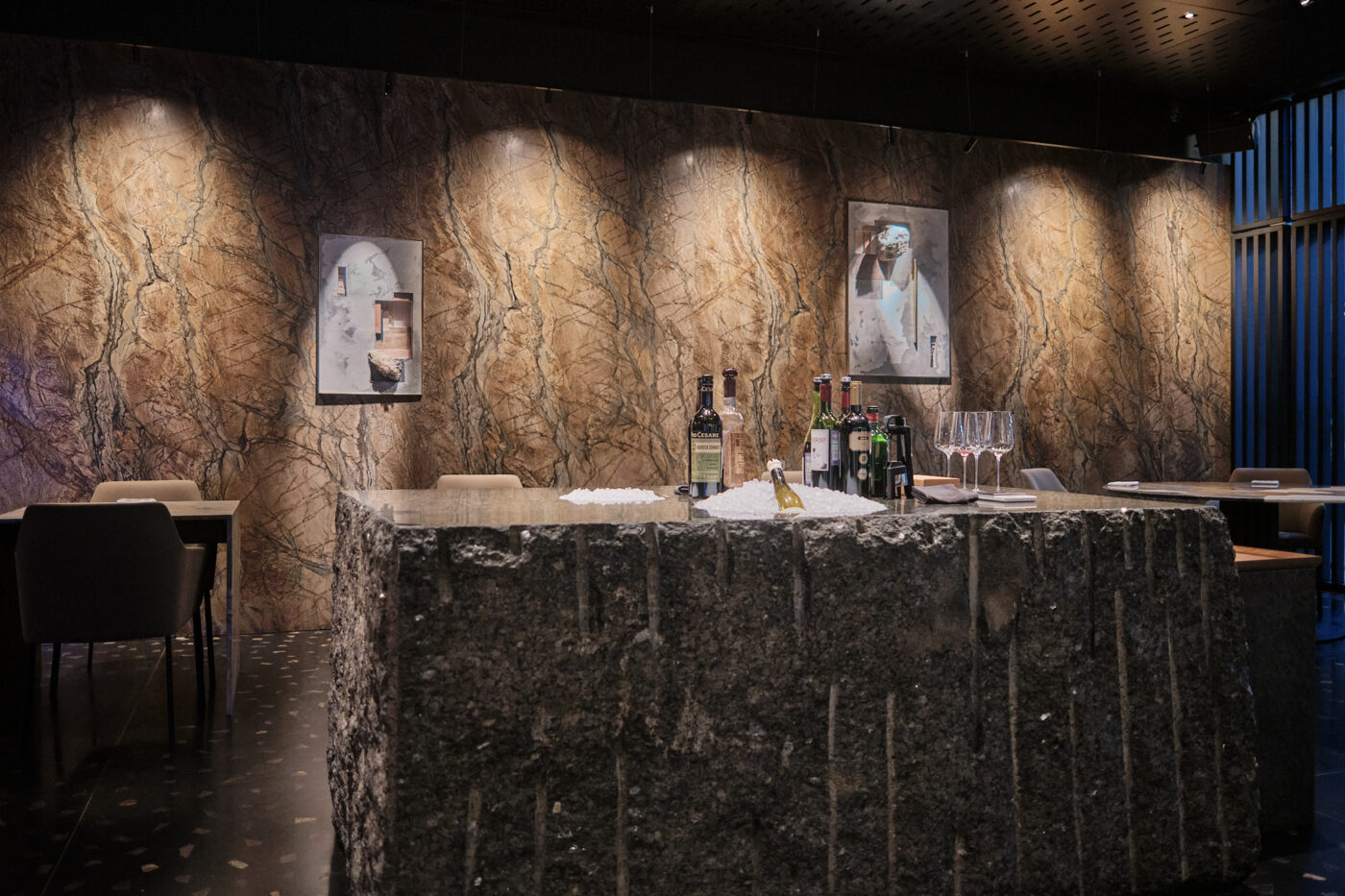 Near the center of the room stood a massive granite island filled with ice, where wine and spirits were elegantly displayed—a show-stopping feature that also served a practical purpose: keeping the evening’s beverages perfectly chilled. I noticed only one large table in the distance, presumably reserved for big groups or special celebrations, while the remaining tables—mostly configured for three or four guests—added a layer of intimacy to the setting. It felt like the ideal venue for a quiet date night, a romantic dinner, or in our case, a culinary adventure shared between two inquisitive palates.