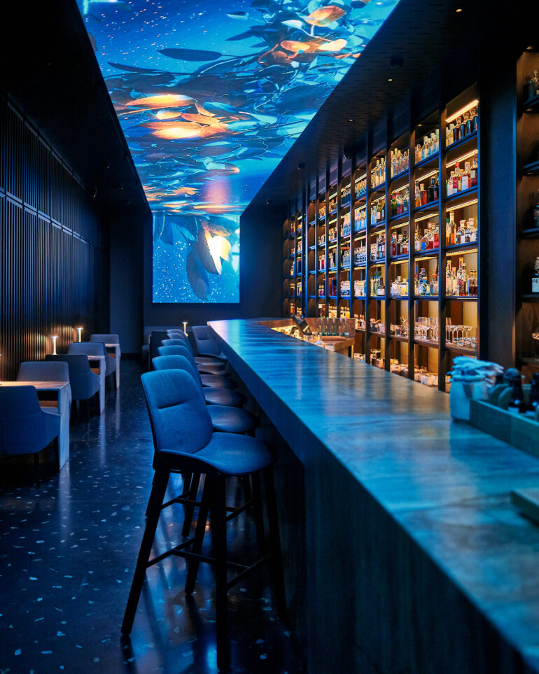 On my previous visit, we were seated in the bar area, spellbound by a mesmerizing LED ceiling that cycled through vivid rainforest and oceanic imagery. By contrast, this second visit placed us in a magnificent room defined by its luxurious materials—polished granite floors, exotic hardwood tables, and walls composed of deeply veined orange-toned granite. The lighting here was artfully designed, highlighting the dramatic swirls of stone and lending a soft, welcoming glow to every corner of the room. Everything seemed meticulously chosen to create a sense of both grandeur and comfort, there the gentle dancing of flames in the long, thin fireplace stretching across the restaurant’s flickering over the glass and wood surfaces.